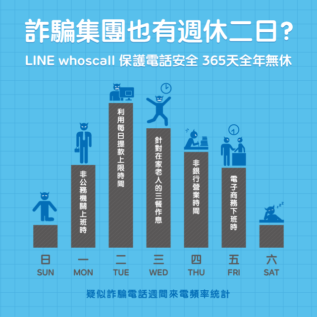 最近刑事局165專線根據民眾報案資訊統計,推移出每天詐騙集團犯案時間的時間軸,並將該圖表與「銀行營業時間」,「電子商務業者下班時間」,「公務人員下班時間」等資訊重合,發現詐騙事件發生的時間規律與高峰值都落在以上區段。
